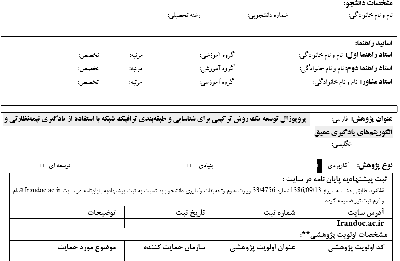 موضوع اصلی این پروپوزال ” توسعه یک روش ترکیبی برای شناسایی و طبقهبندی ترافیک شبکه با استفاده از یادگیری نیمهنظارتی و الگوریتمهای یادگیری عمیق” است. تعداد صفحات پروپوزال 7 صفحه با رعایت قالب استاندارد فرم دانشگاه می باشد. کلیه نکات نگارشی مطابق با استاندارهای پژوهشی انجام شده است.